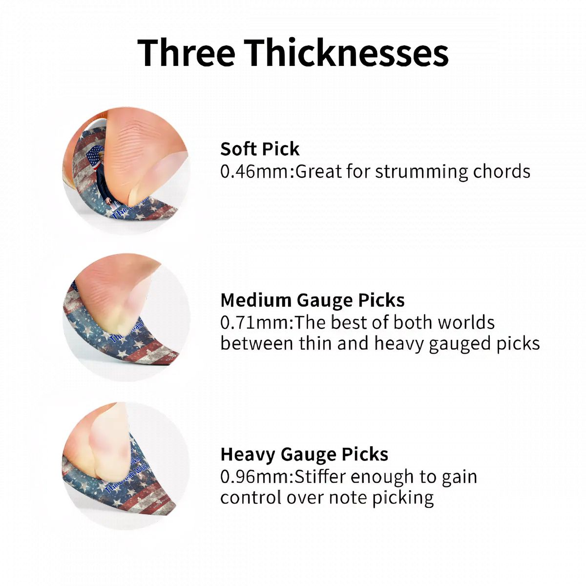 It feels comfortable, has smooth edges, strong wear resistance and toughness, clear patterns, and 3 thicknesses to choose from, giving you a different musical experience. The pick makes the guitar tone clear, and picks of different thicknesses have different tones. Thin picks have bright and crisp tones, while thick picks have thick and full tones. Customizable patterns.