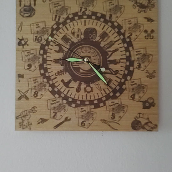 Hand Made Wood, Laser Etched Mechanic Clock, 12" x 12"