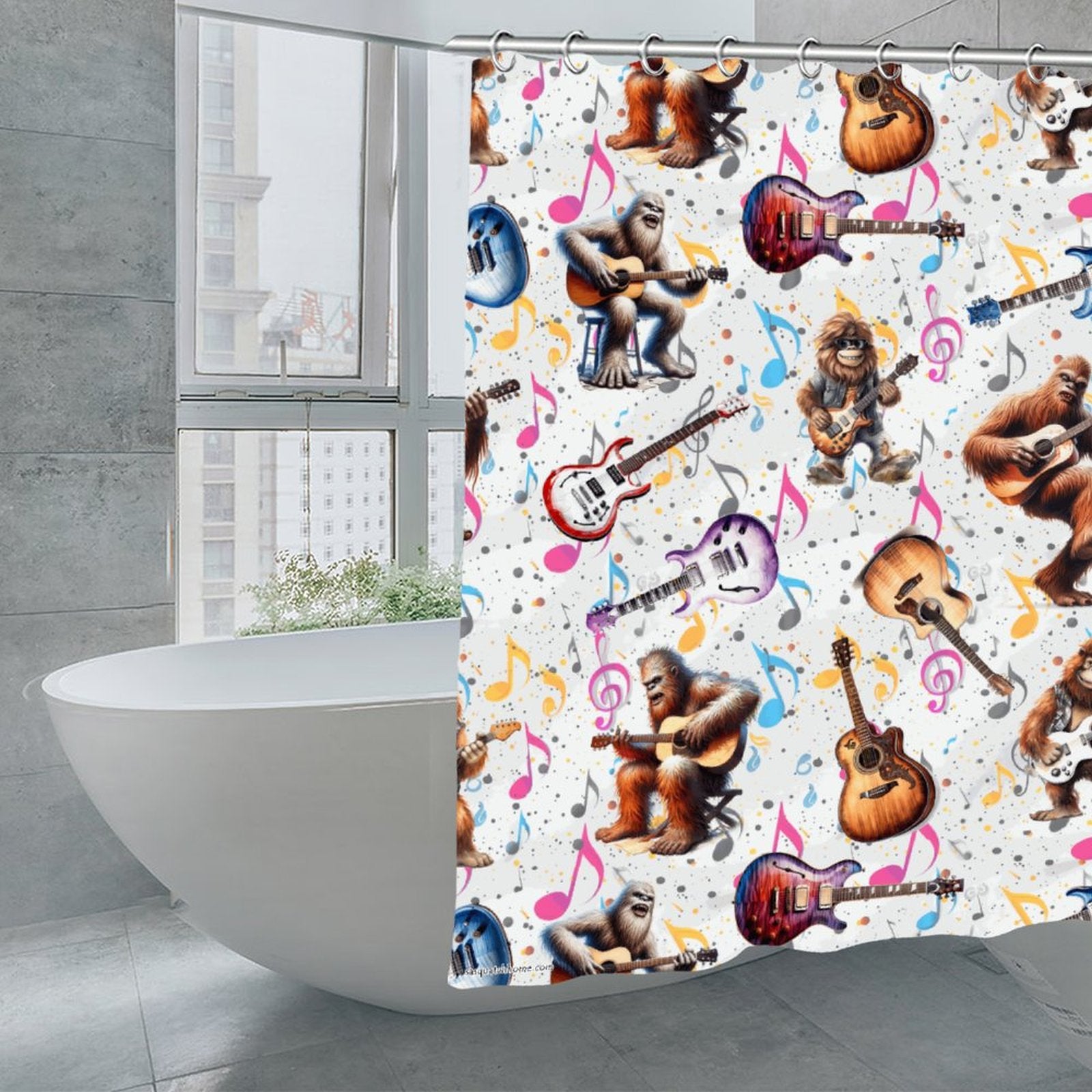 Bigfoot Sasquatch Playing Guitars, Waterproof Polyester Shower Curtain – Made in the USA – 70.8x70.8”
